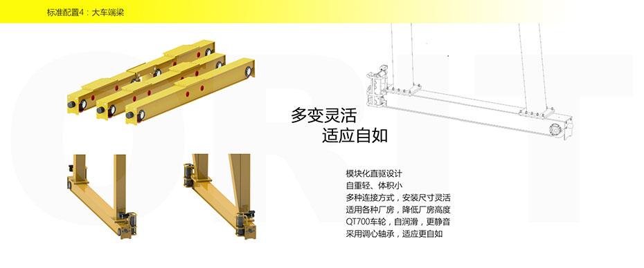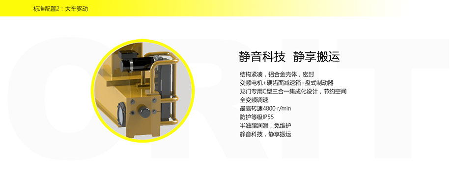 柔性支腿,有效釋放應力,延長結構壽命。柔性支腿,讓龍門小巧玲瓏,節(jié)省空間。變頻控制,運行平穩(wěn)實時安全監(jiān)控,確保吊運安全。標準化統(tǒng)一配置,讓整機性能更加穩(wěn)定。無牛腿車間的搬運解決方案。適用于20t以下額定載荷起吊。