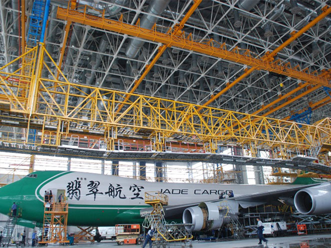 應(yīng)用于飛機(jī)制造工廠、飛機(jī)維修機(jī)庫(kù)、飛機(jī)噴漆機(jī)庫(kù)、飛機(jī)拆解機(jī)庫(kù),適配A380、A330、B747、B787、C919、C929、Y20等全系列飛機(jī),更大跨度90米,最多7支點(diǎn)。